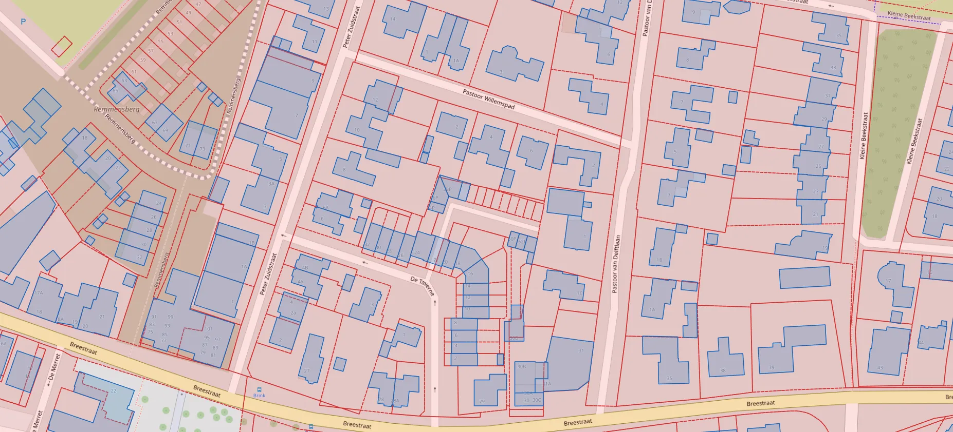 Alle data komt van officiële bronnen: de Basisregistratie Kadaster (BRK) voor perceelgrenzen en de Basisregistratie Adressen en Gebouwen (BAG) voor gebouwinformatie. Deze worden ontsloten via PDOK (Publieke Dienstverlening Op de Kaart).